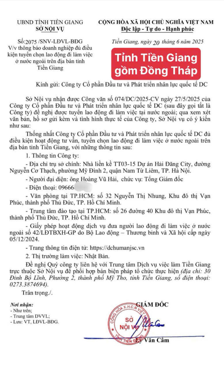 Doanh nghiệp được Bộ LĐTB&XH cấp phép chính thức số 42/LĐTBXH-GP, đảm bảo uy tín và đầy đủ pháp lý trong hoạt động đưa lao động đi làm việc ở nước ngoài