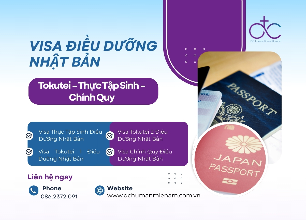 Tìm hiểu chi tiết các loại visa điều dưỡng Nhật Bản: Tokutei 1, tokutei 2, Thực tập sinh và Chính quy. Khám phá lộ trình đào tạo chuyên sâu, mức lương hấp dẫn và cơ hội định cư lâu dài cùng DC Human ngay hôm nay!